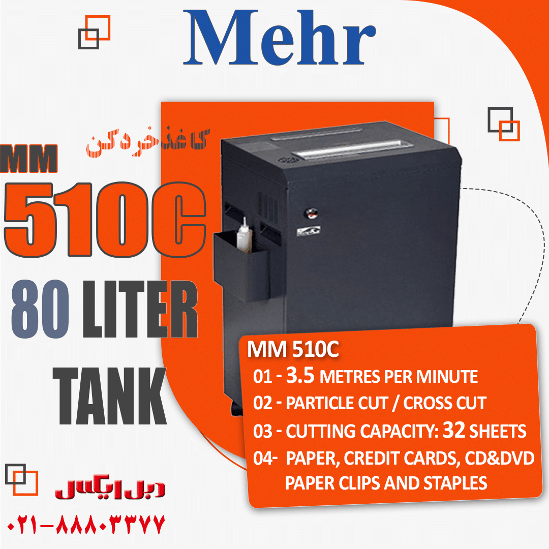 از کاغذخردکن های صنعتی برند مهر میتوان مدل MM-510c را نام برد که برای مراکز صنعتی و تولیدی با حجم کاری بالا مورد استفاده قرار میگیرد. تعداد کاغذهایی که میتوان به طور همزمان داخل دهانه ورودی این کاغذخردکن گذاشت 32 برگ بوده و عرض آن 31 سانتیمتر است. علاوه بر کاغذ میتوان با این دستگاه کارت اعتباری، سوزن، کلیپس و CD را نیز امحاء کرد. داشتن ویژگی Auto Reverse از جمع شدن کاغذ جلوگیری کرده و در مواقع لازم آن را به طور اتوماتیک بیرون میدهد.